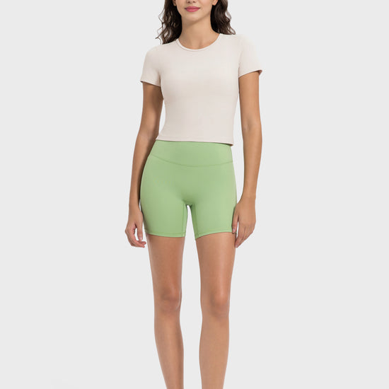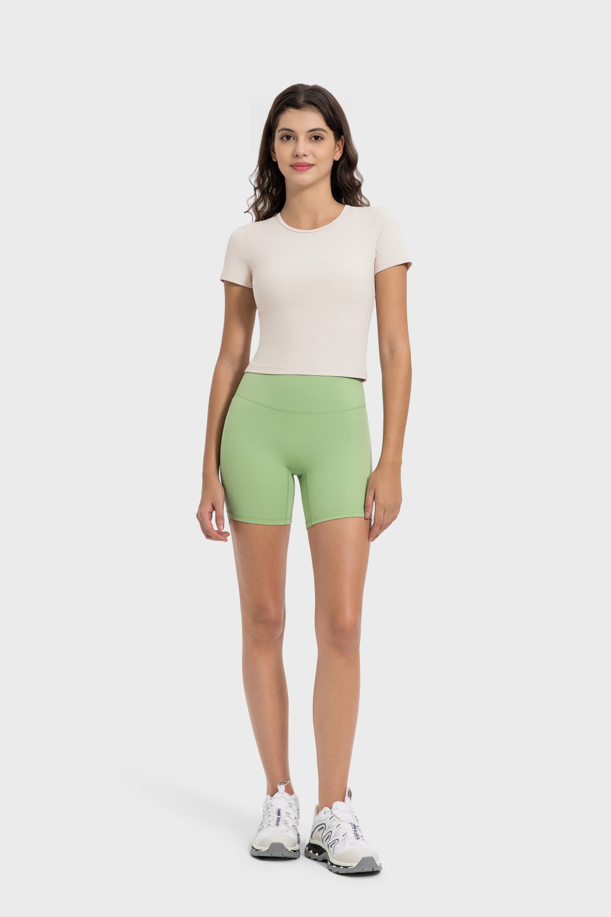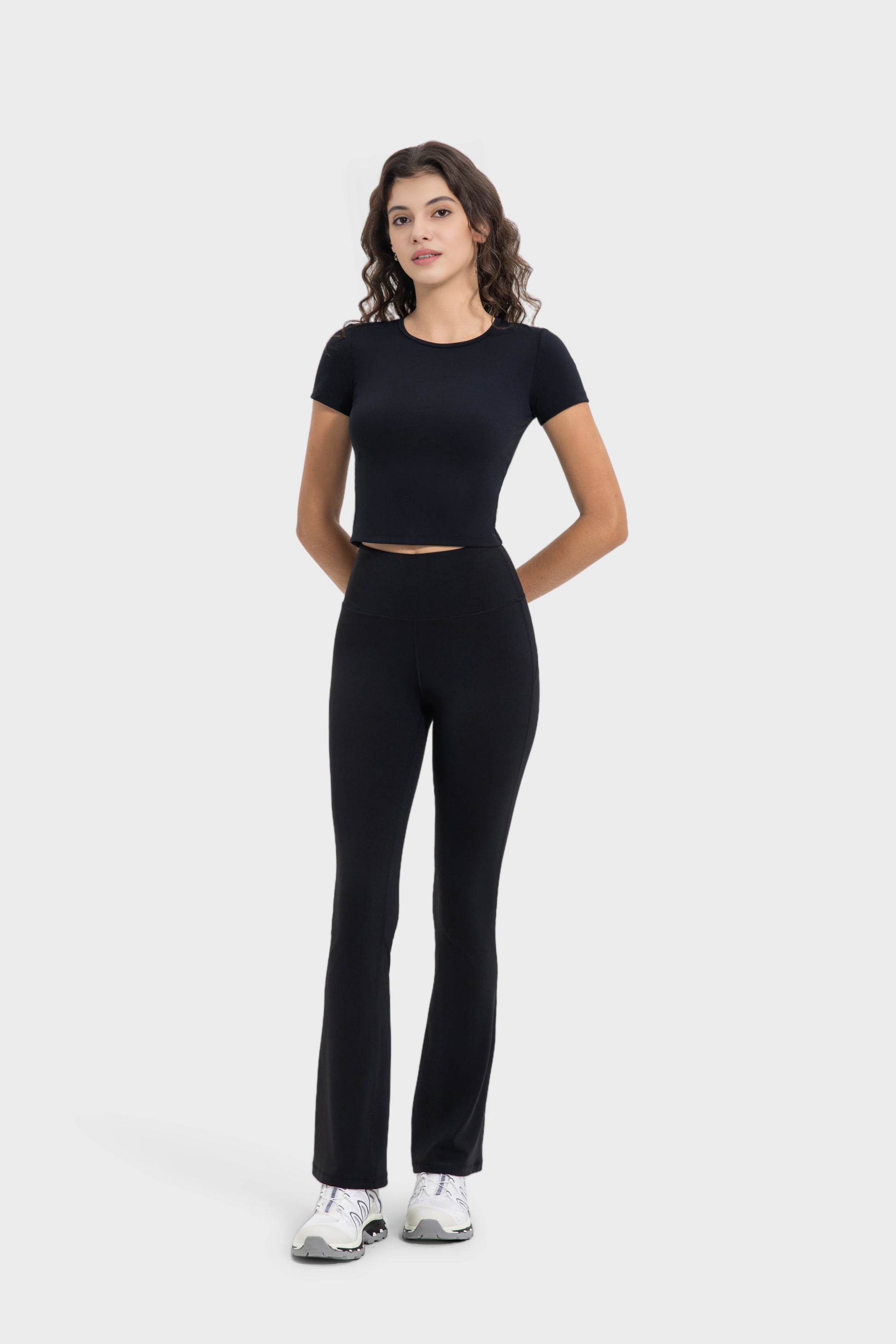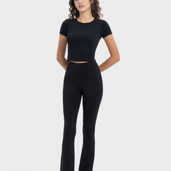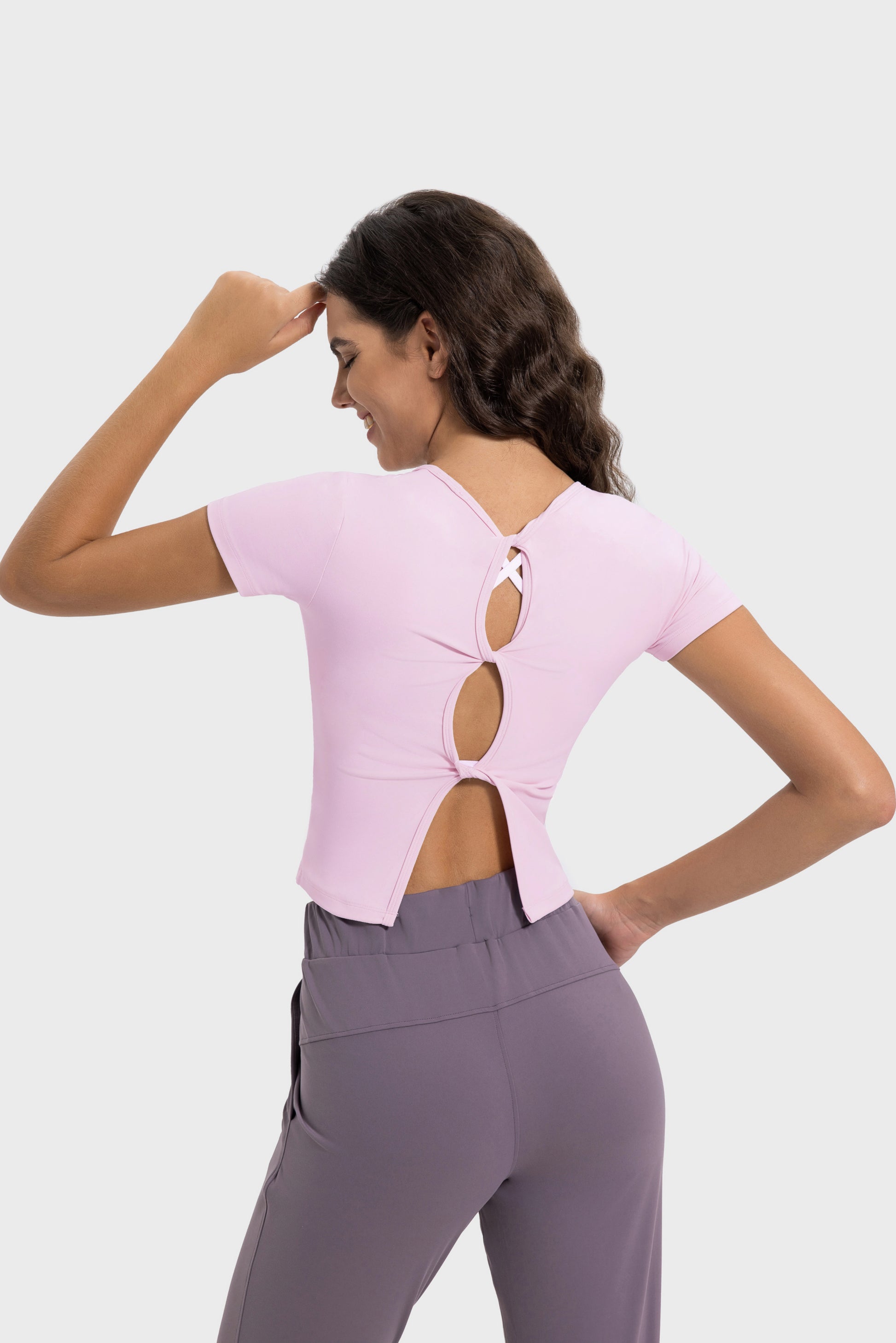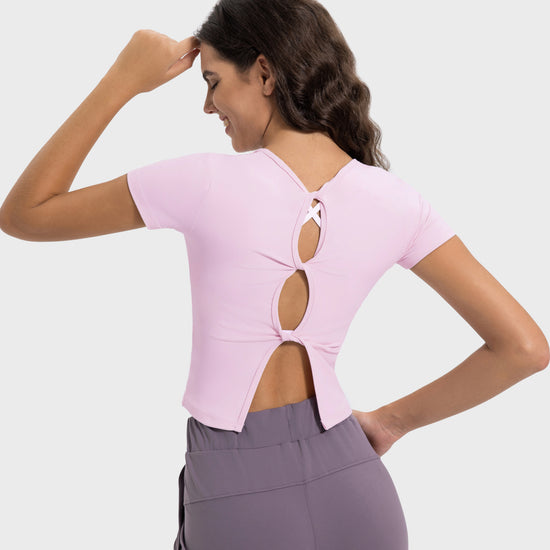 This sports back short sleeved shirt features minimalist colors and a bold hollowed out design on the back, outlining elegant back lines while forming natural breathable channels, making it refreshing and non sticky during exercise. High elasticity skin friendly fabric fits the body like a second layer of skin, allowing for unrestricted yoga stretching or high-intensity training. The unique cut cleverly modifies the shoulder and neck curves, and can release fashionable tension when worn alone or on the outside. It is an all-around athlete from the gym to the street, making every sweat a confident runway.