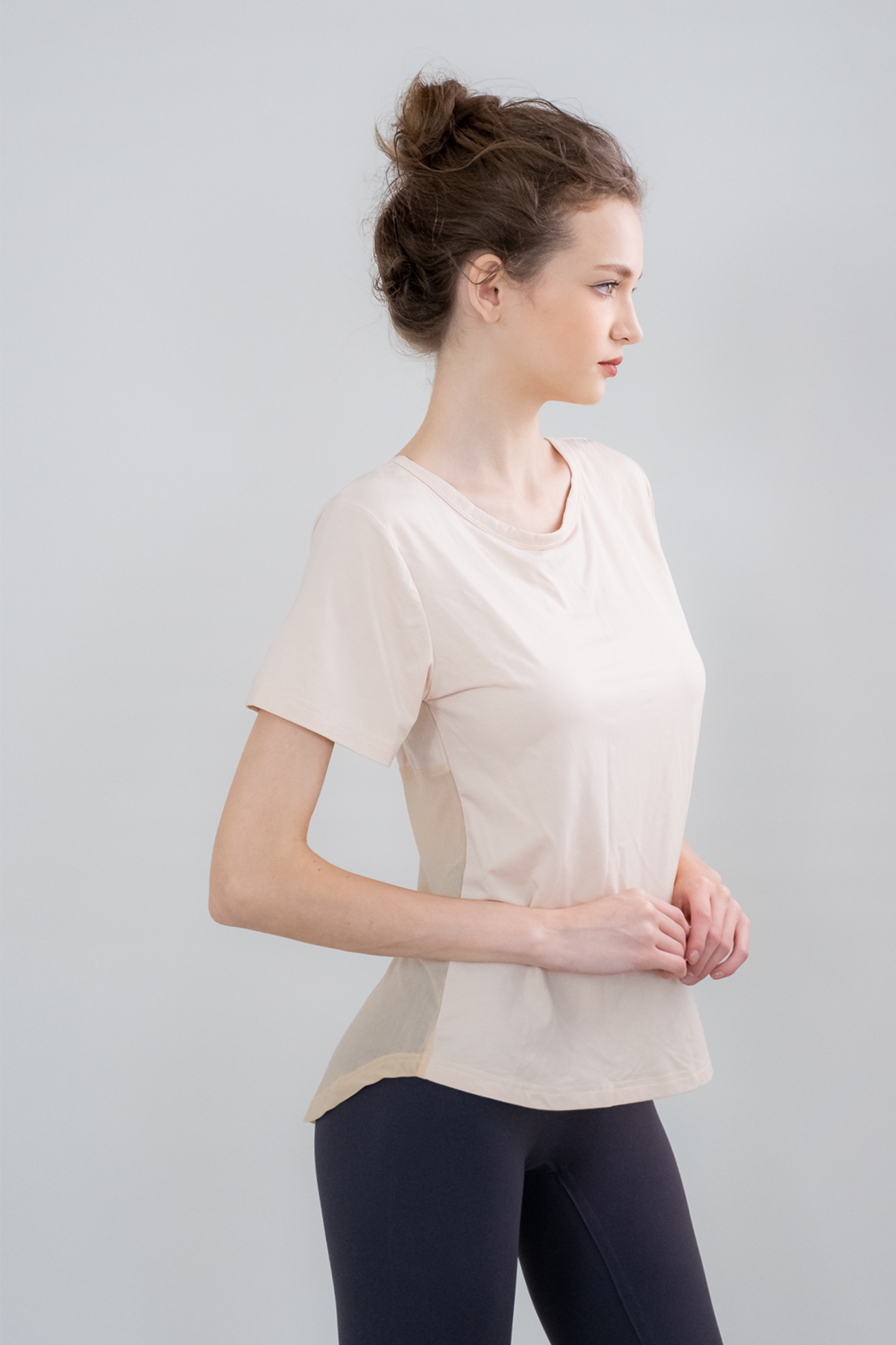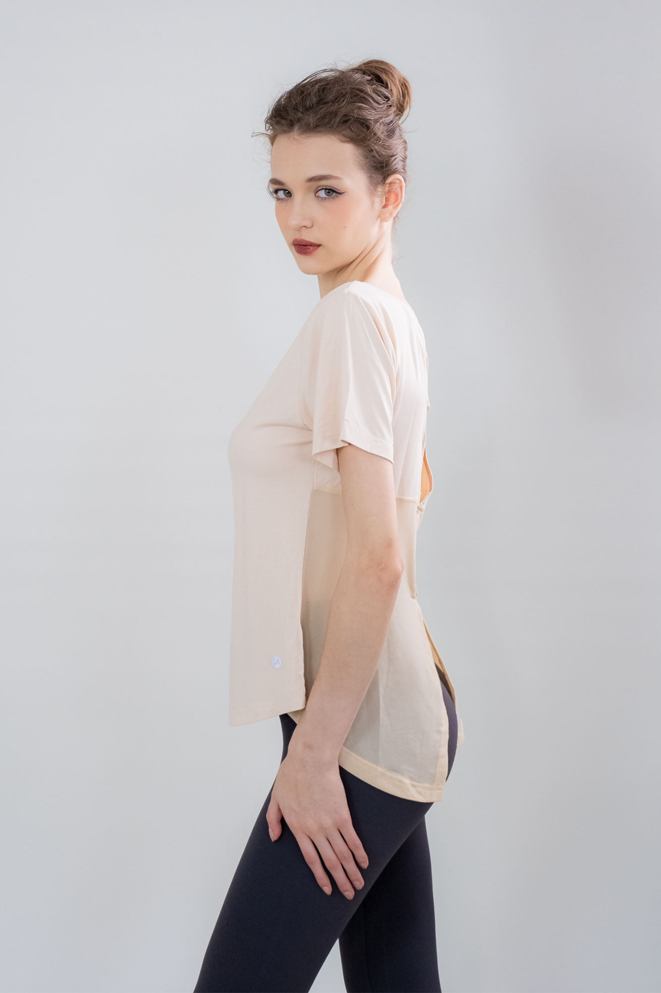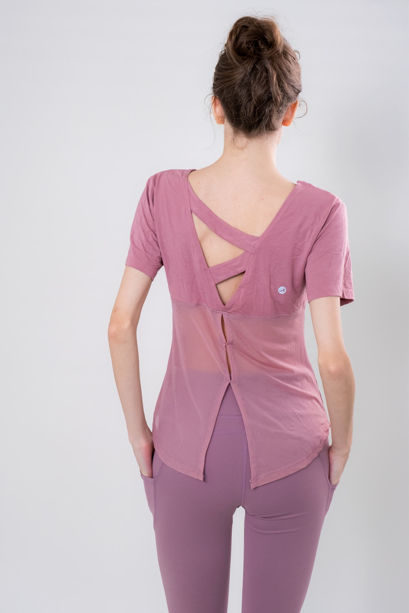 What sets it apart is the unique back design: the upper part features twin straps that exude elegance, while the lower section showcases a split-mesh design. On the front, a sleek and chic pure color design enhances its versatility, imparting a touch of understated style. The loose, relaxed fit ensures unhindered movement, effortlessly guiding you through yoga poses or various activities with grace and ease.