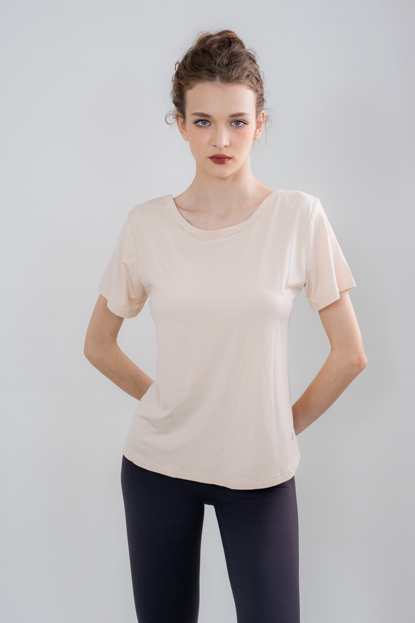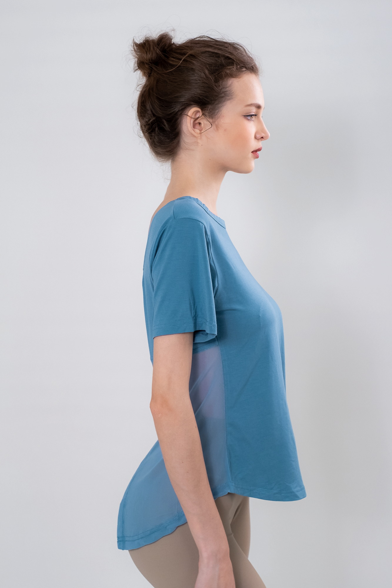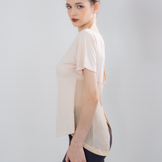 What sets it apart is the unique back design: the upper part features twin straps that exude elegance, while the lower section showcases a split-mesh design. On the front, a sleek and chic pure color design enhances its versatility, imparting a touch of understated style. The loose, relaxed fit ensures unhindered movement, effortlessly guiding you through yoga poses or various activities with grace and ease.