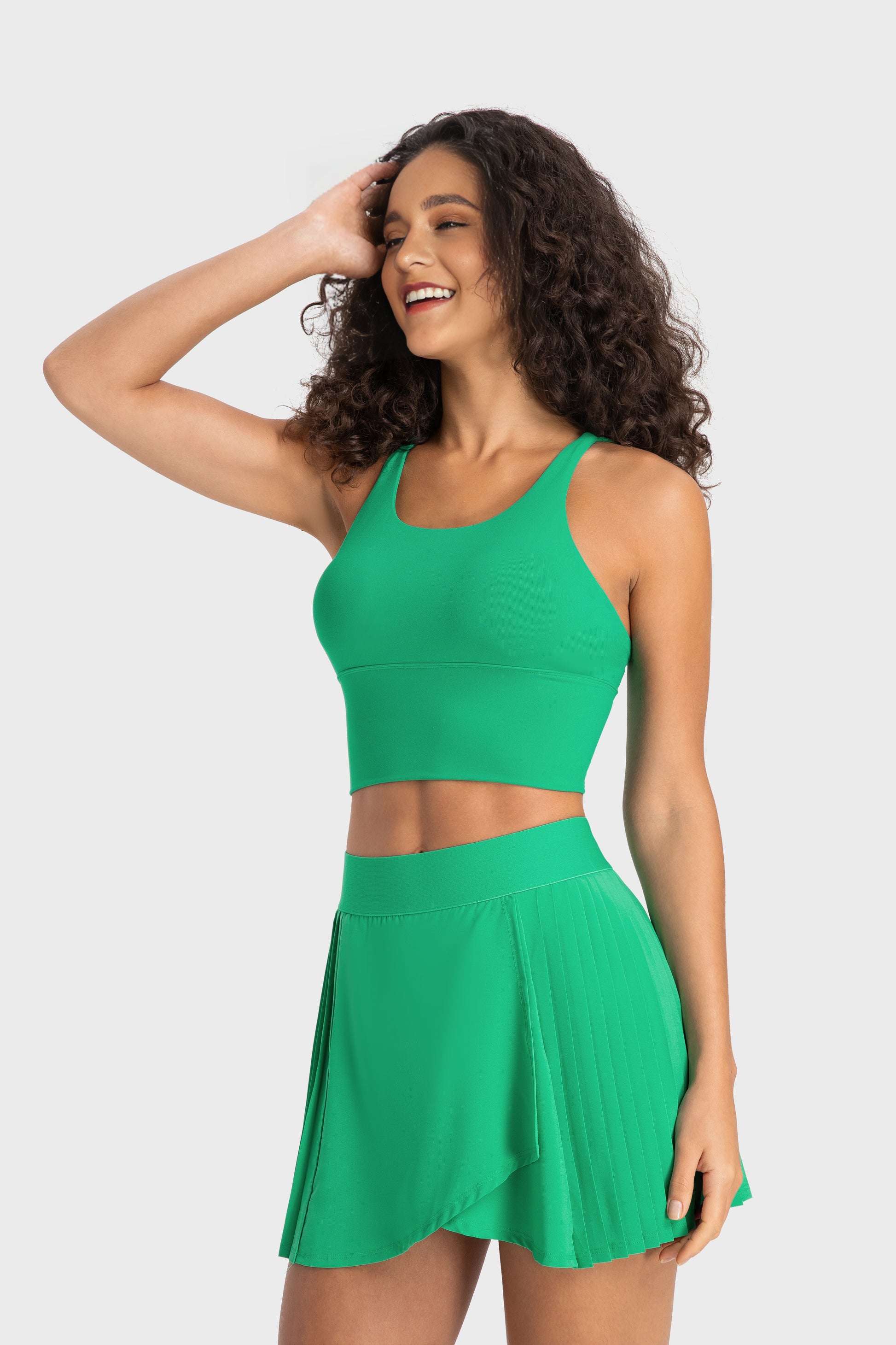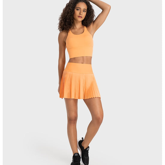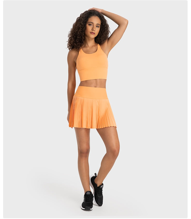 With its unique cut and vibrant colours, this stylish suit will add a splash of colour to your wardrobe. We've created a special Boston Orange and Scallion green version to suit different styles and occasions.The top is designed with cross straps and a delicate knot at the back to show off the feminine backline and add a touch of sex appeal. Pair it with a pleated skirt in the same color, the soft fabric sways with the wind and the waistline is clearly defined to create a delicate figure, exuding glamour with every step.Whether it's a daily trip or a special occasion, this suit will make you the centre of attention. Choose it and start your colorful fashion journey!