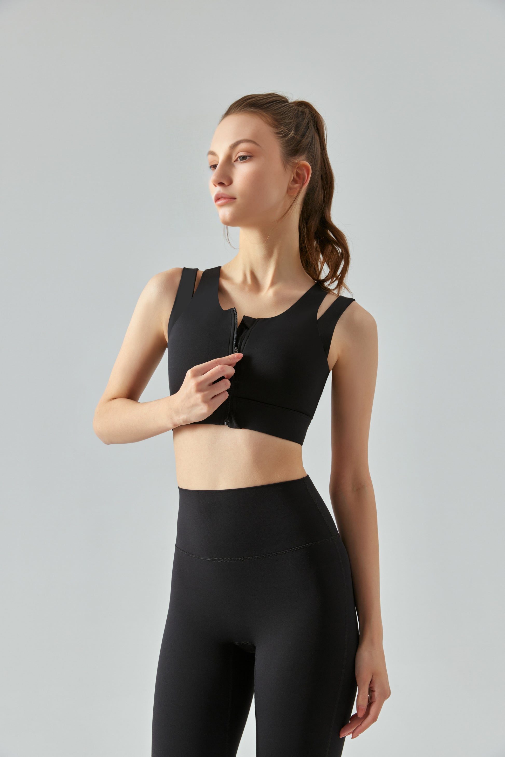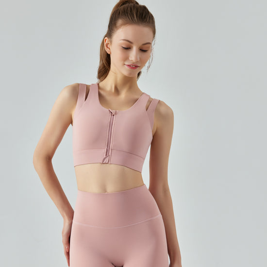 Adopting an innovative front zipper design, it can be easily opened with just one touch, making it convenient and worry free to put on and take off. Among them, the clay powder color scheme is gentle and elegant, suitable for various skin tones. The combination of high elasticity fabric and three-dimensional cutting provides medium strength support, ensuring a stable and non tight fit during exercise. Whether it's fitness shaping or yoga meditation, they can allow you to stretch freely and enjoy your exercise time to the fullest.