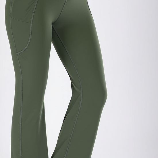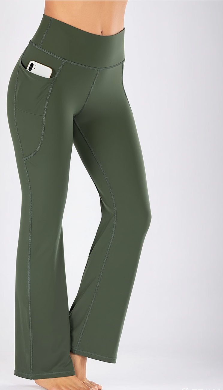 This high waisted yoga pants feature a dark gray color scheme, simple and versatile. The three-dimensional cut wraps around the waist and abdomen, with slightly flared cuffs to shape the legs, and hidden side pockets for convenient storage. The high stretch fabric fits the skin and allows for unrestricted stretching during exercise. The high waisted design provides core support, making it a comfortable choice for yoga, Pilates, and other settings. It combines functionality with daily dressing attributes.