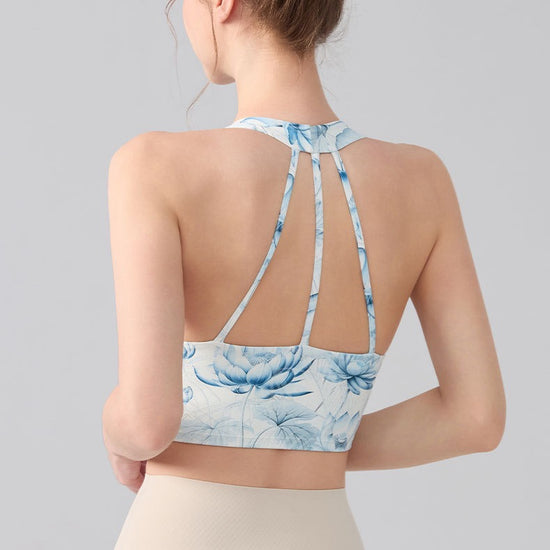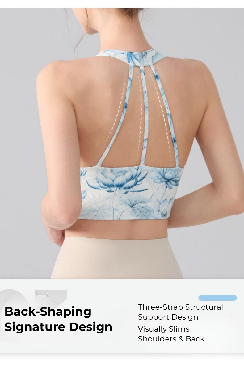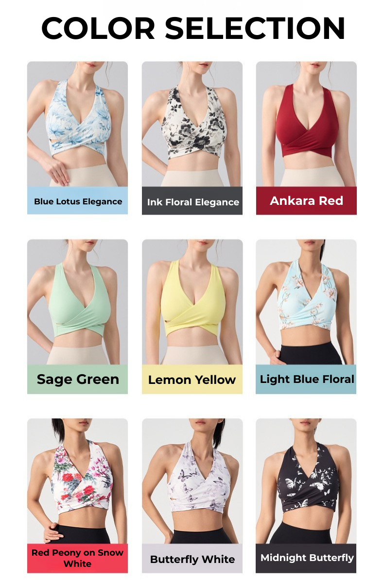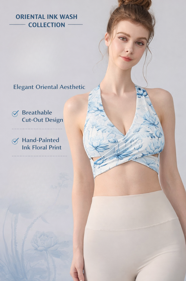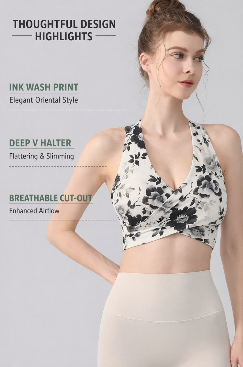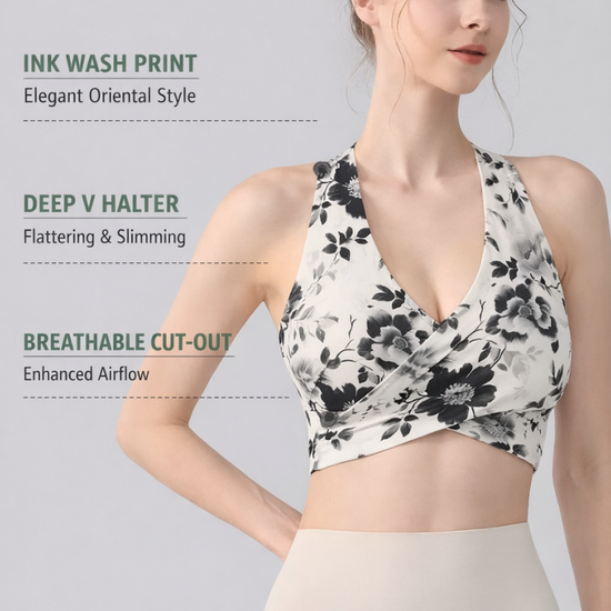 Inspired by traditional ink-wash art, the Ink Floral Halter Sports Bra blends elegant design with high-performance comfort. Featuring a deep V halter silhouette, twist front shaping, and breathable underbust cut-out, this seamless activewear yoga top delivers both sculpting support and standout style.