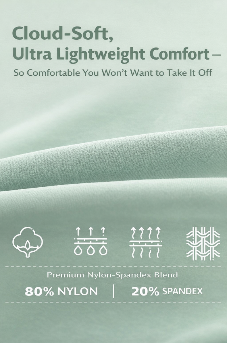 Crafted from a premium nylon-spandex blend (80% nylon, 20% spandex), the fabric provides cloud-soft comfort, four-way stretch, and moisture-wicking breathability — keeping you cool through workouts and daily wear.