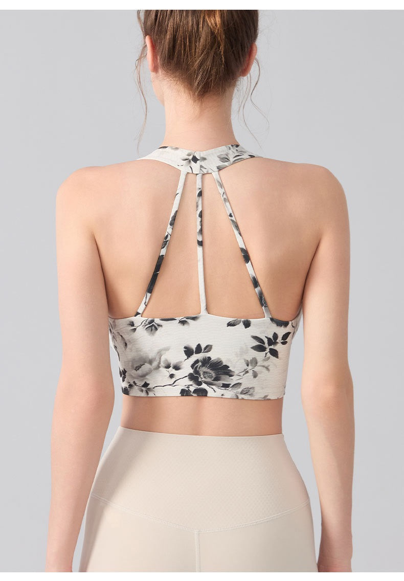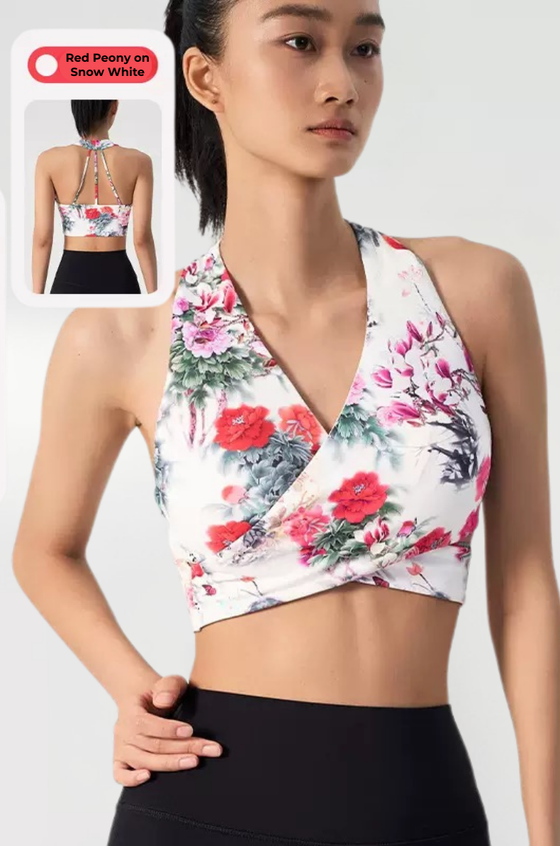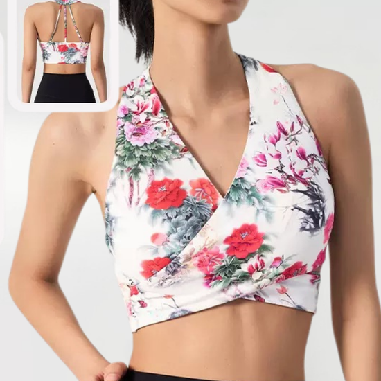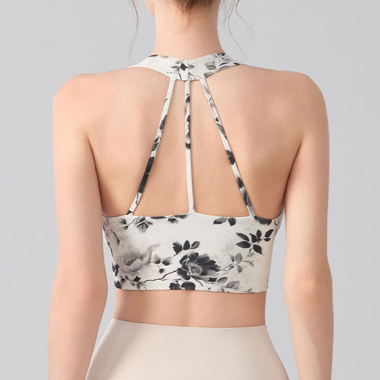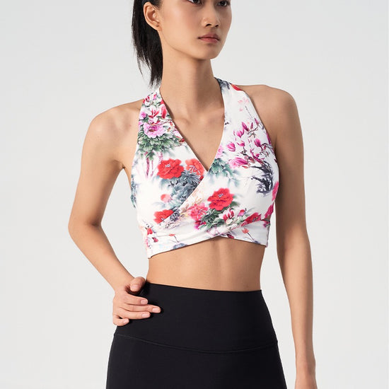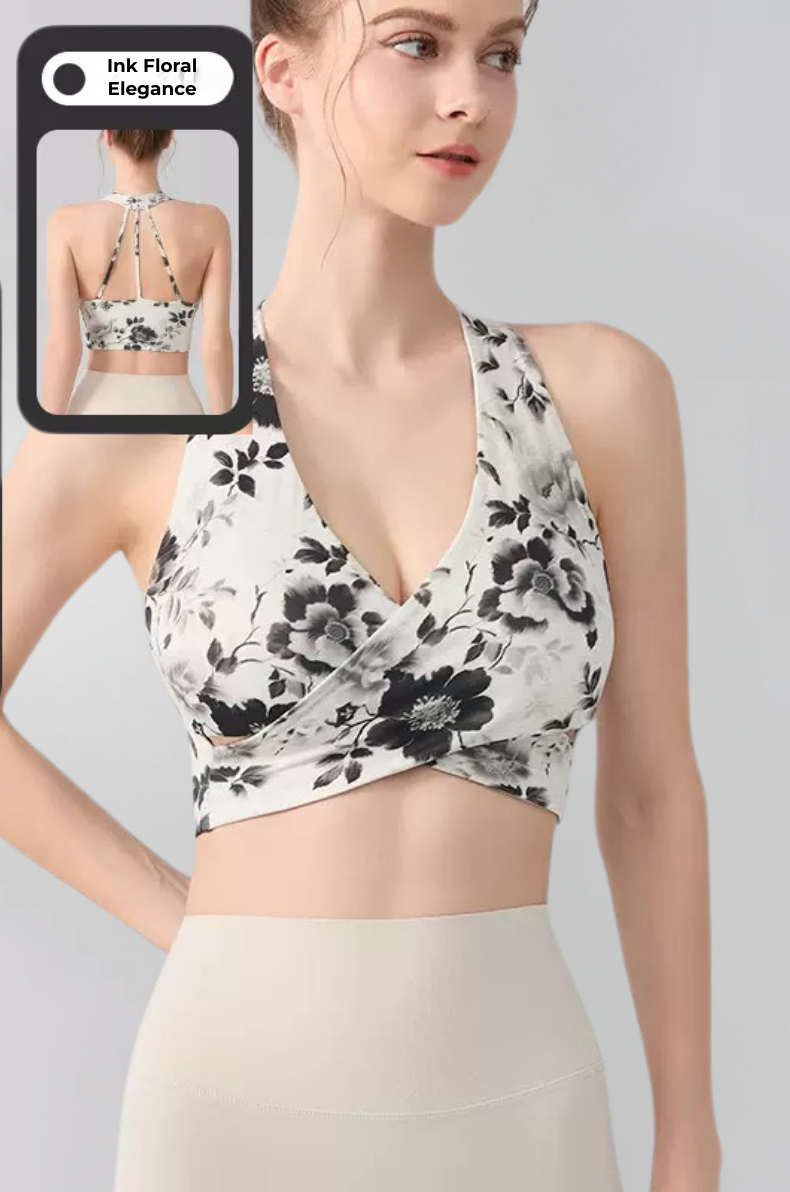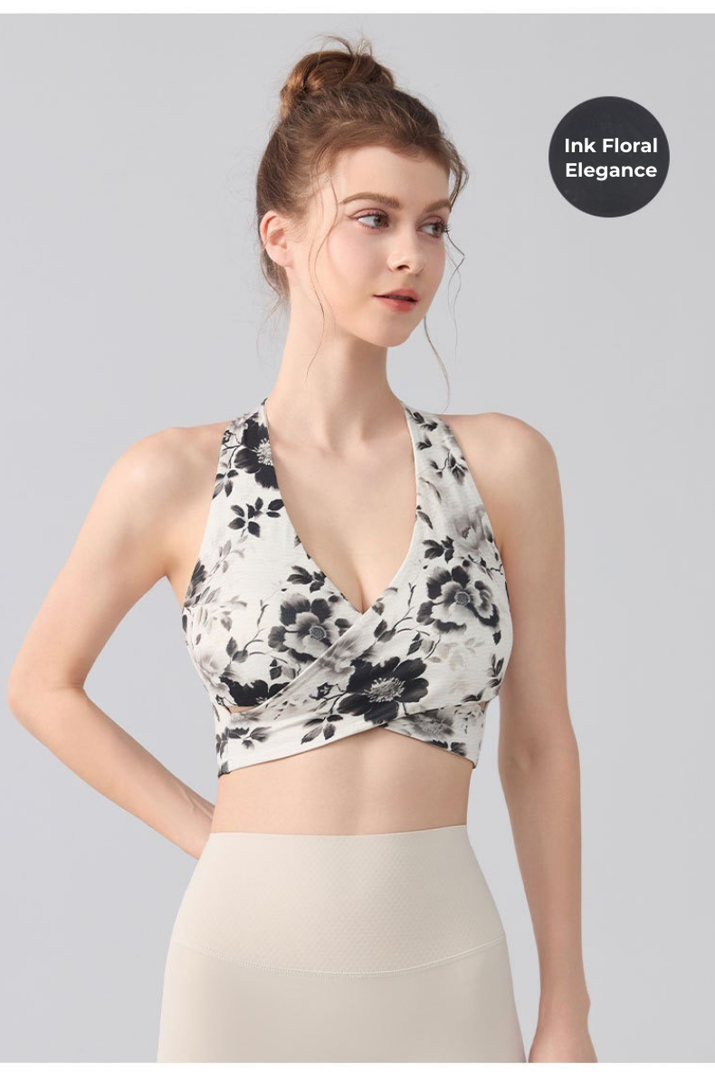 Ink Floral Halter Sports Bra – Twist Front Seamless Yoga Top