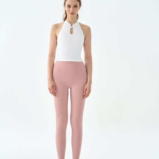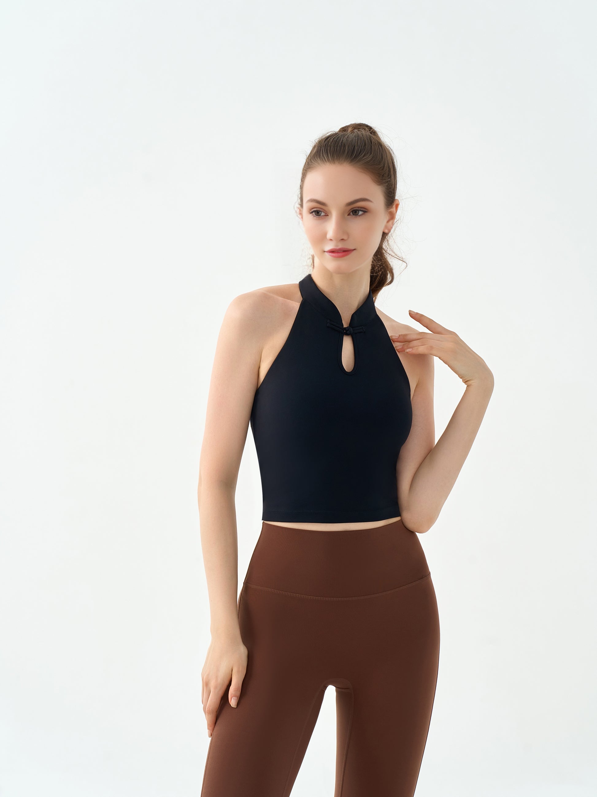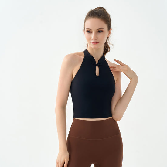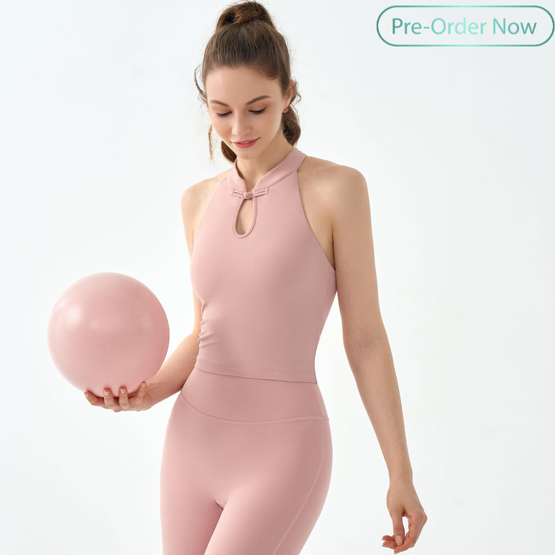 Oriental style sports underwear, with a cheongsam style water droplet neckline embellishing the neck lines, and low shoulder strap design releasing shoulder freedom. Built in 3D three-dimensional support cup, gently wraps around the chest curve, providing stable support during yoga and Pilates. One piece seamless cut paired with breathable nude fabric, making every stretch as light as a cloud, creating a gentle power specially designed for Eastern women!