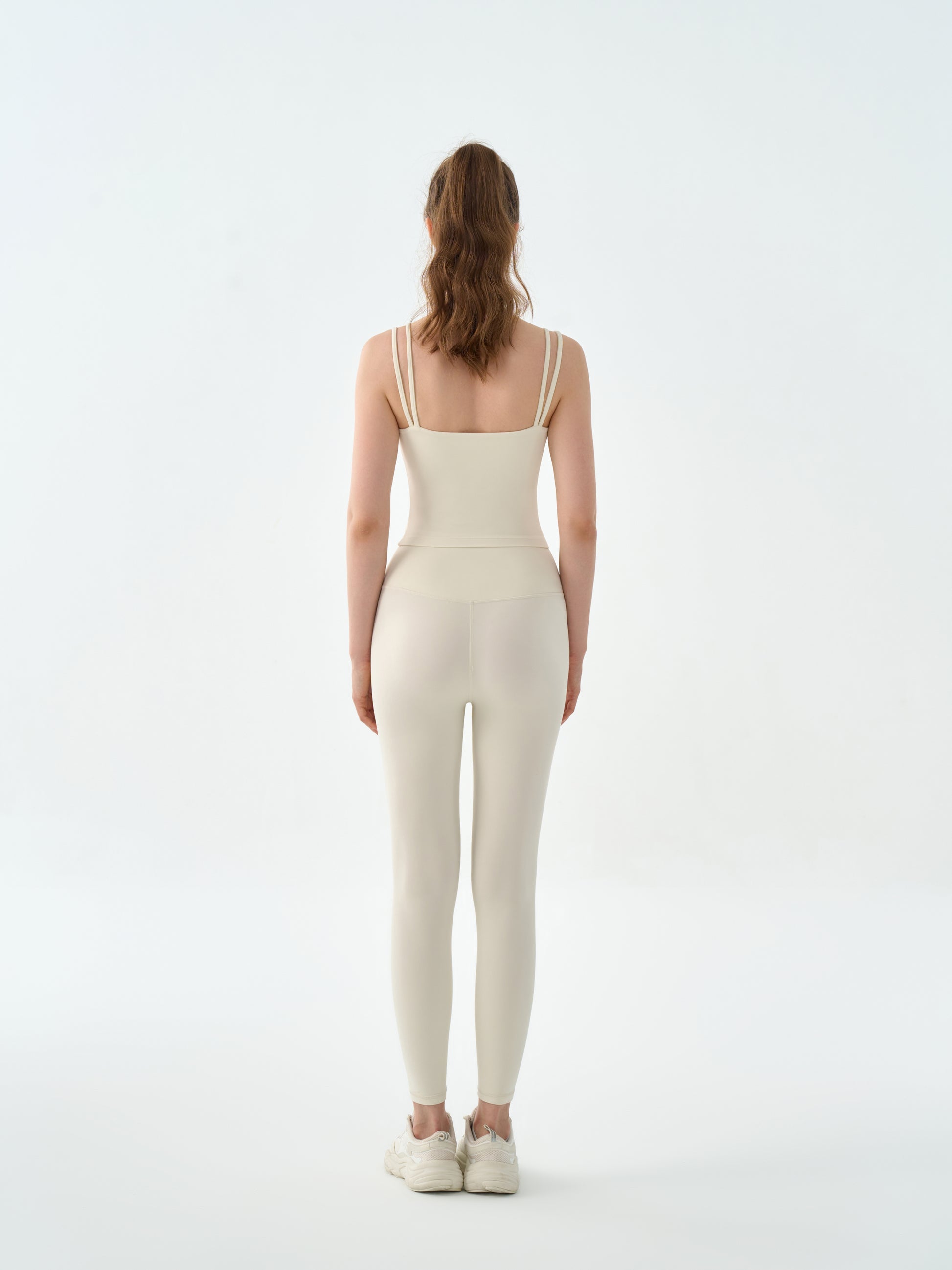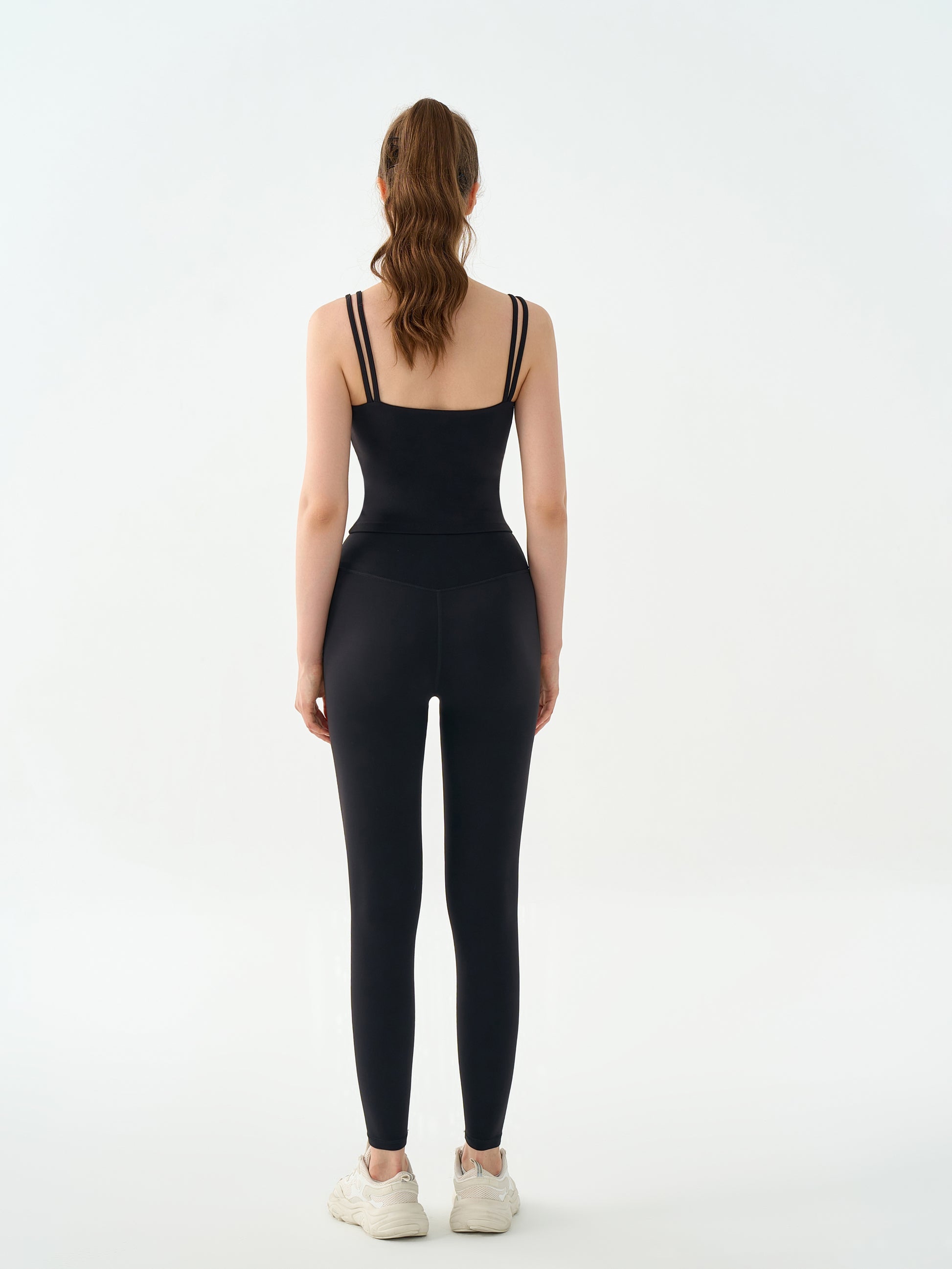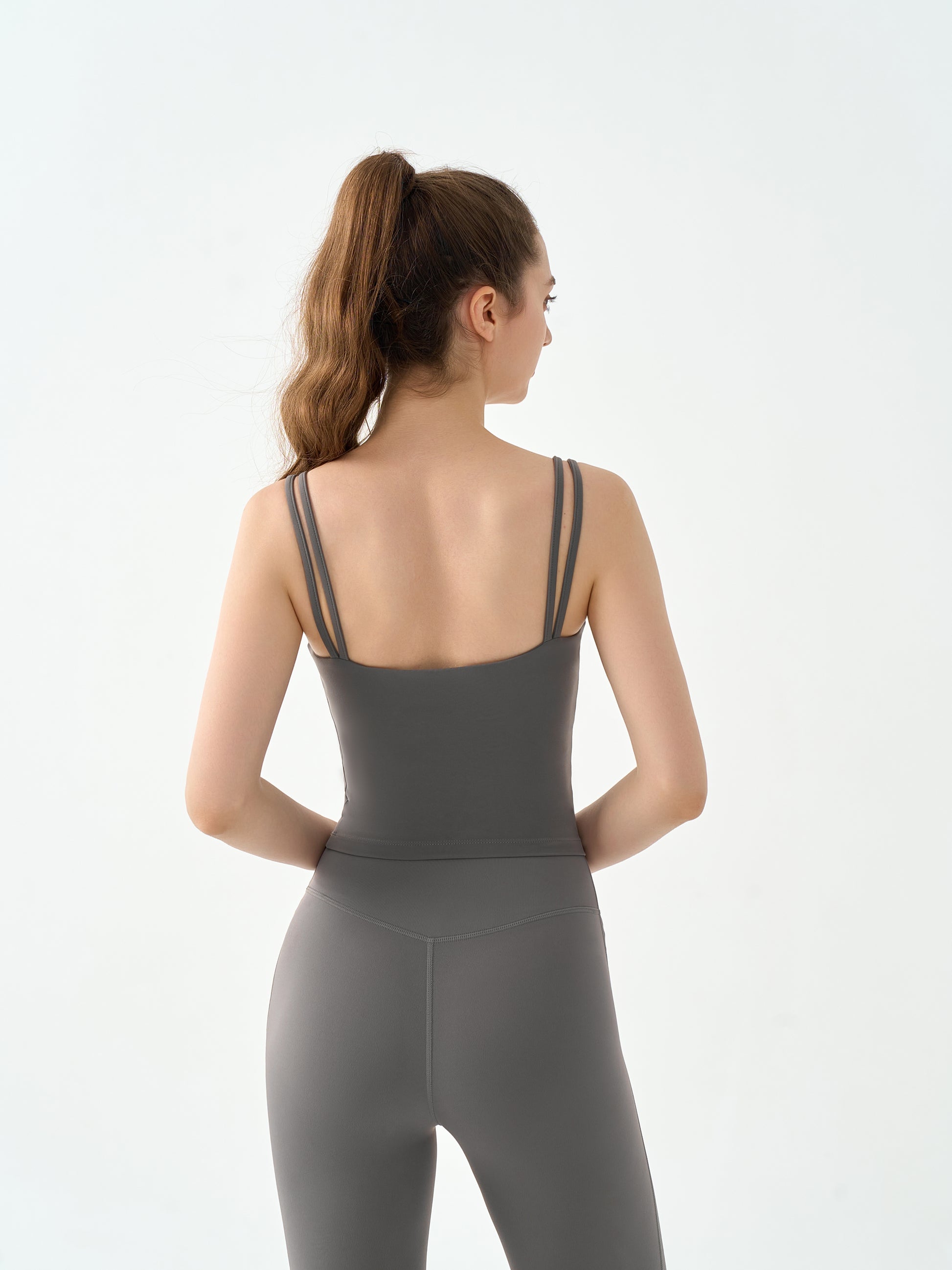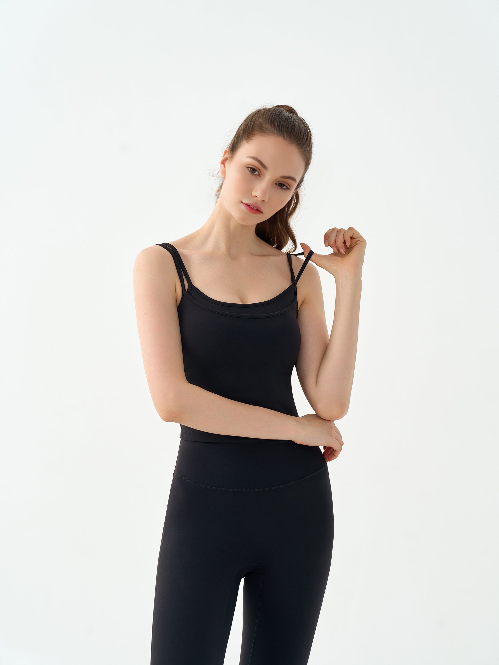This sports bra reconstructs the classic with a fake two-piece design. The outer layer of the tank top and the inner layer of the support structure work together seamlessly, steadily wrapping around the chest curve and ensuring high-intensity exercise without running a cup. The double thin shoulder straps form a golden cross angle, scientifically dispersing pressure and visually extending the shoulder and neck lines. The integrated chest cushion eliminates the need for extra underwear restraint, and the high elasticity fabric combined with breathable mesh splicing seamlessly connects the squats in the yoga studio with the afternoon tea in the coffee shop. From sweating and shaping to fashionable streetwear, unlock a confident posture all day long!