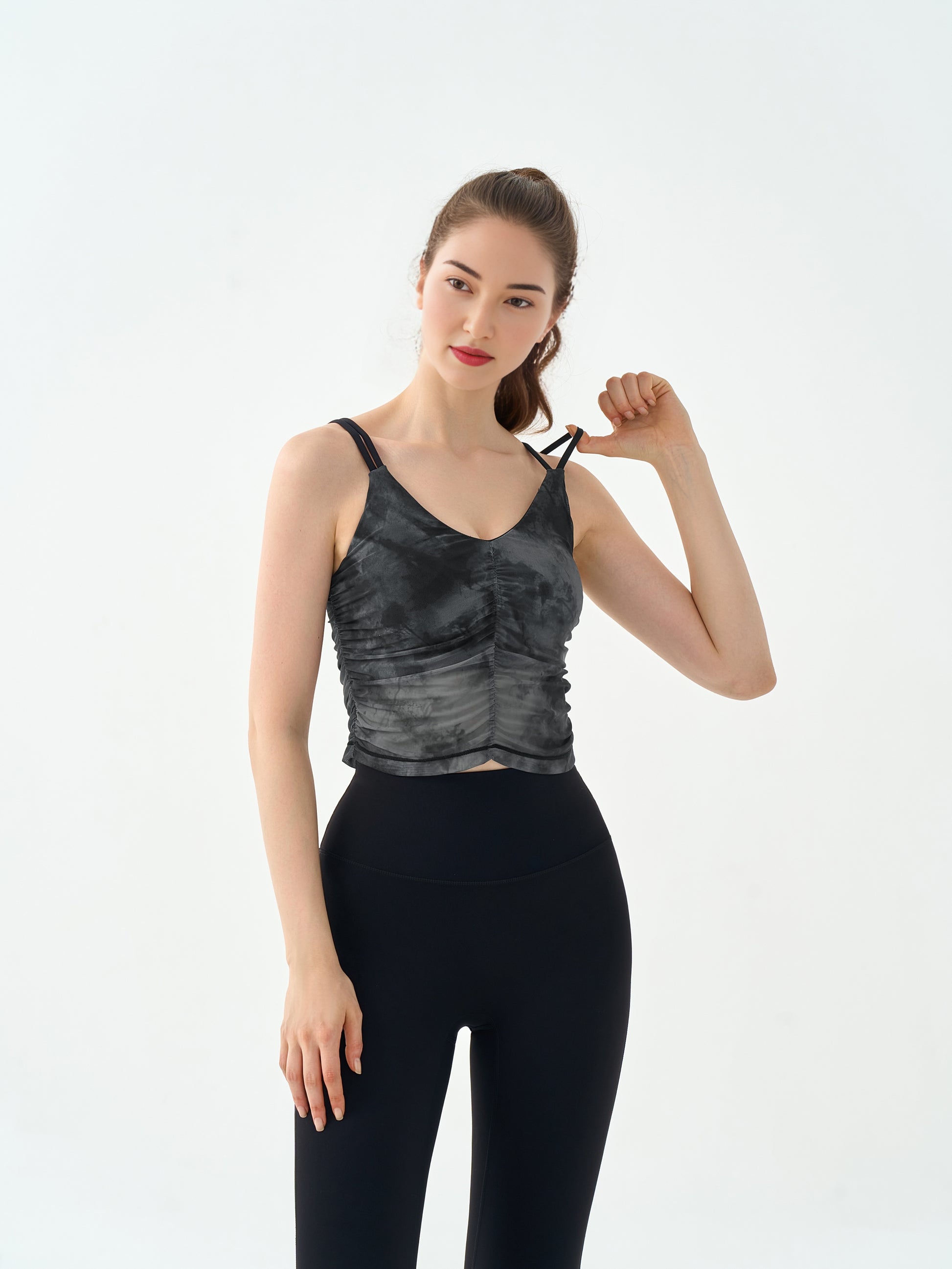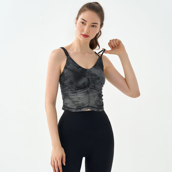 Fashionable and functional! Using natural gradient tie dyeing technology to interweave a unique artistic sense. The front three-dimensional pleated design outlines charming curves, while the thin shoulder straps balance support and lightness. High elasticity fabric wraps around the body, allowing for free stretching during exercise and showcasing personal charm in daily wear, unlocking double the charm of sports and fashion!
