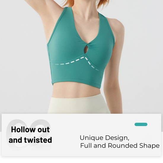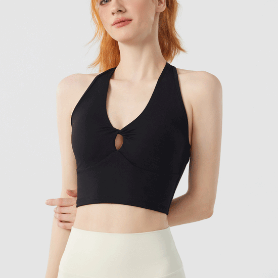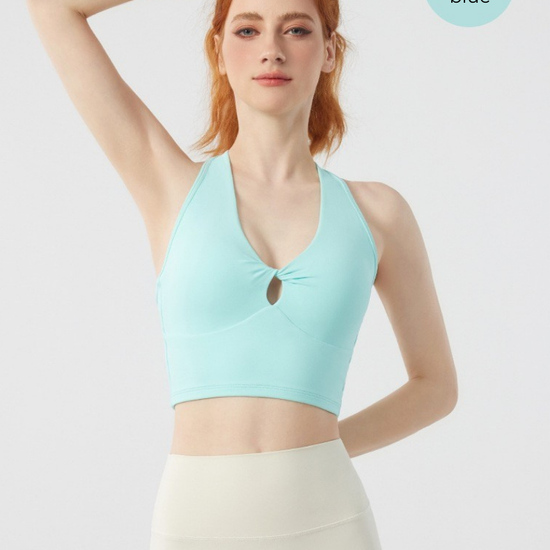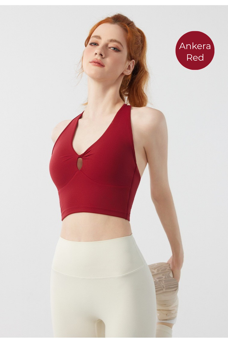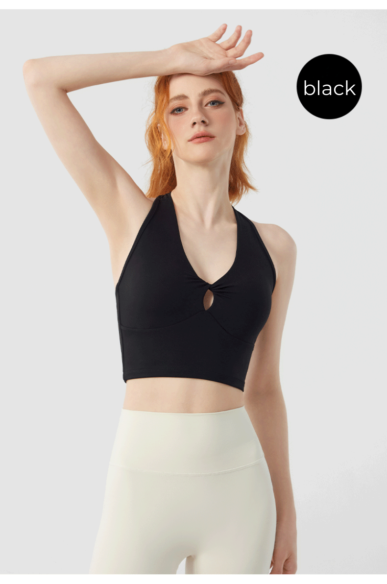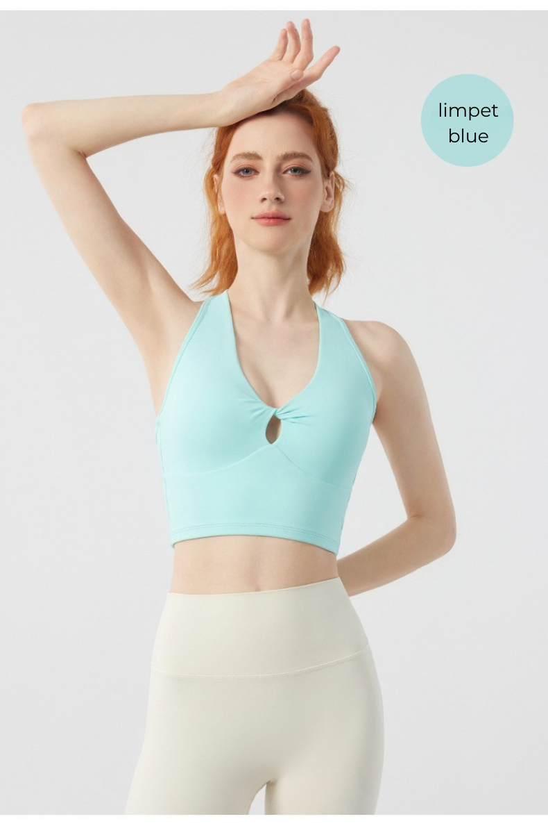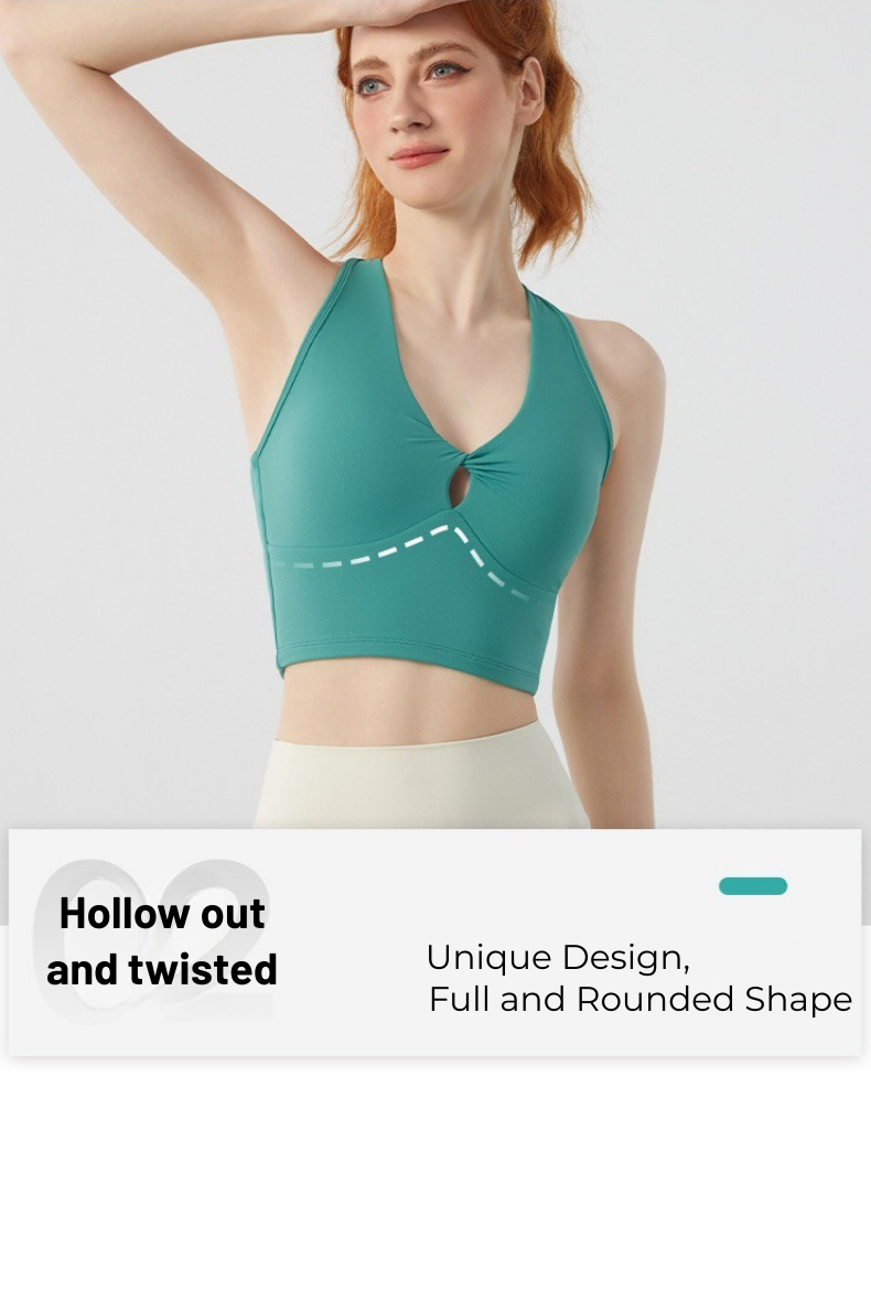 Designed for movement and style, the Twist Front Strappy Back Sports Bra delivers supportive comfort with a sculpted, feminine silhouette. Featuring a unique hollow twist front and elegant strappy back design, this seamless longline activewear yoga top blends performance functionality with everyday athleisure style.