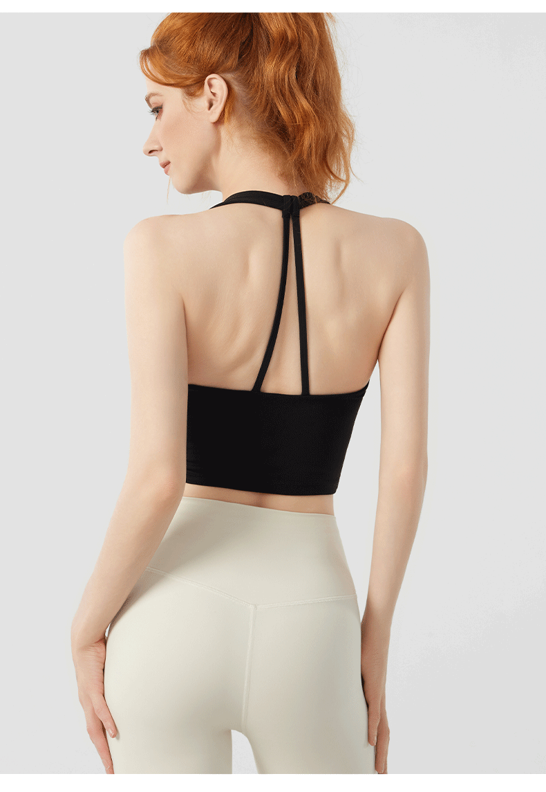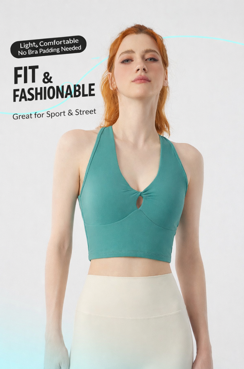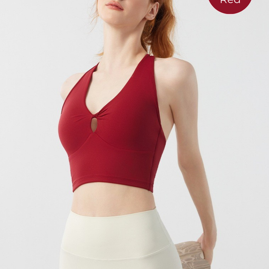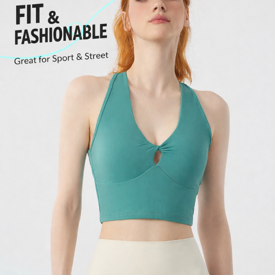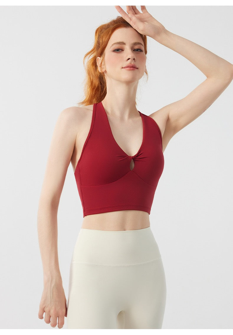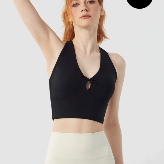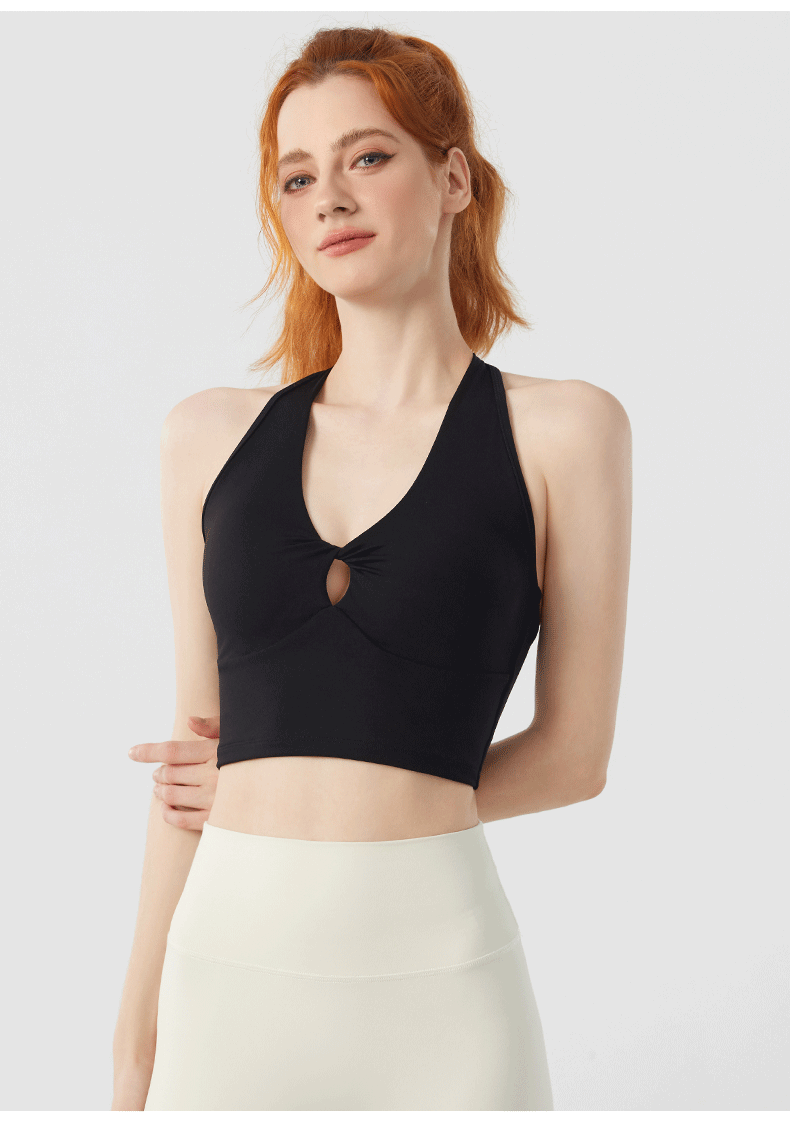 Designed for movement and style, the Twist Front Strappy Back Sports Bra delivers supportive comfort with a sculpted, feminine silhouette. Featuring a unique hollow twist front and elegant strappy back design, this seamless longline activewear yoga top blends performance functionality with everyday athleisure style.